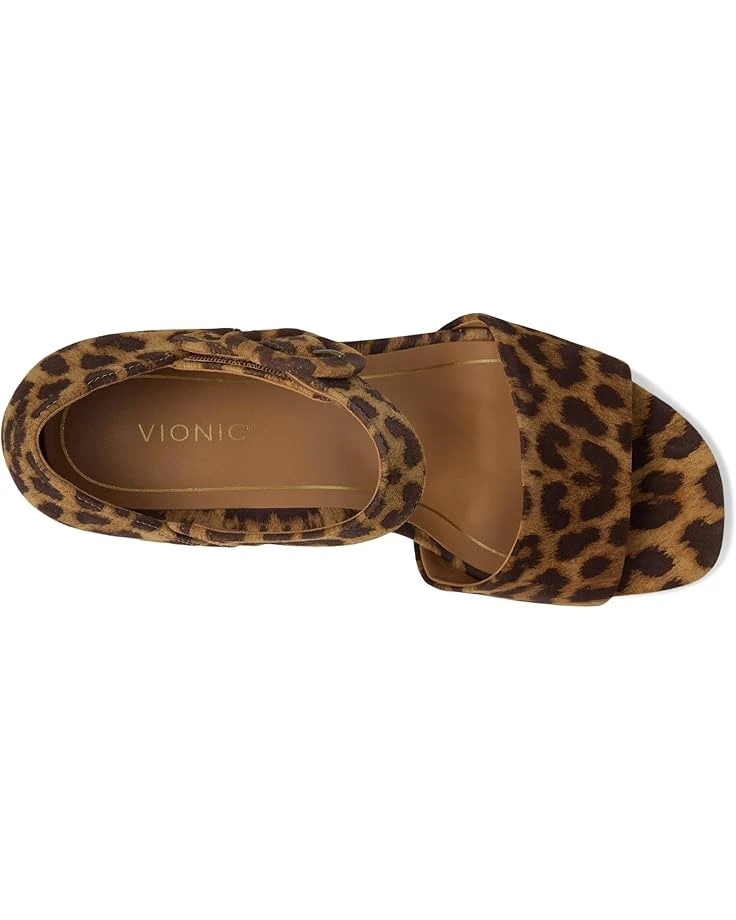 - Expertly designed to elevate your style game while providing enhanced comfort, the VIONIC® Chardonnay Strappy Sandals is perfect for all season wear. The leopard-patterned sandal features a flattering open squared toe shape and a fully adjustable buckle closure at the ankle strap. Designed with exclusive alignment technology to balance the whole you, it comes with a suede or leather upper and polyurethane lining. It also has a built-in VIO MOTION Technology EVA footbed featuring contoured arch support, with shock-absorbing cushioning, deep heel cup to provide stability, and forefoot flexibility. The durable synthetic rubber outsole designed to withstand everyday wear and Meta Dome technology ensures even contact reducing pressure . It’s recommended to wear your new pair for a few hours to allow your feet to adapt to the new support.